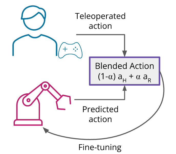 Interactive imitation learning is often used to fine-tune robot policies, especially for manipulation tasks. In this paradigm, control is transferred to a person to demonstrate part of the task whenever the robot has high uncertainty (robot-gated) or the person decides to intervene (human-gated). However, when control is fully handed back to a human demonstrator, it can be cognitively demanding for them to teleoperate a manipulator and their demonstrations might not always be optimal. We're investigating whether blended shared control -- where the user's teleoperated actions and the robot's predicted actions are combined -- can reduce this burden while still providing a valuable training signal for improving manipulation policies.